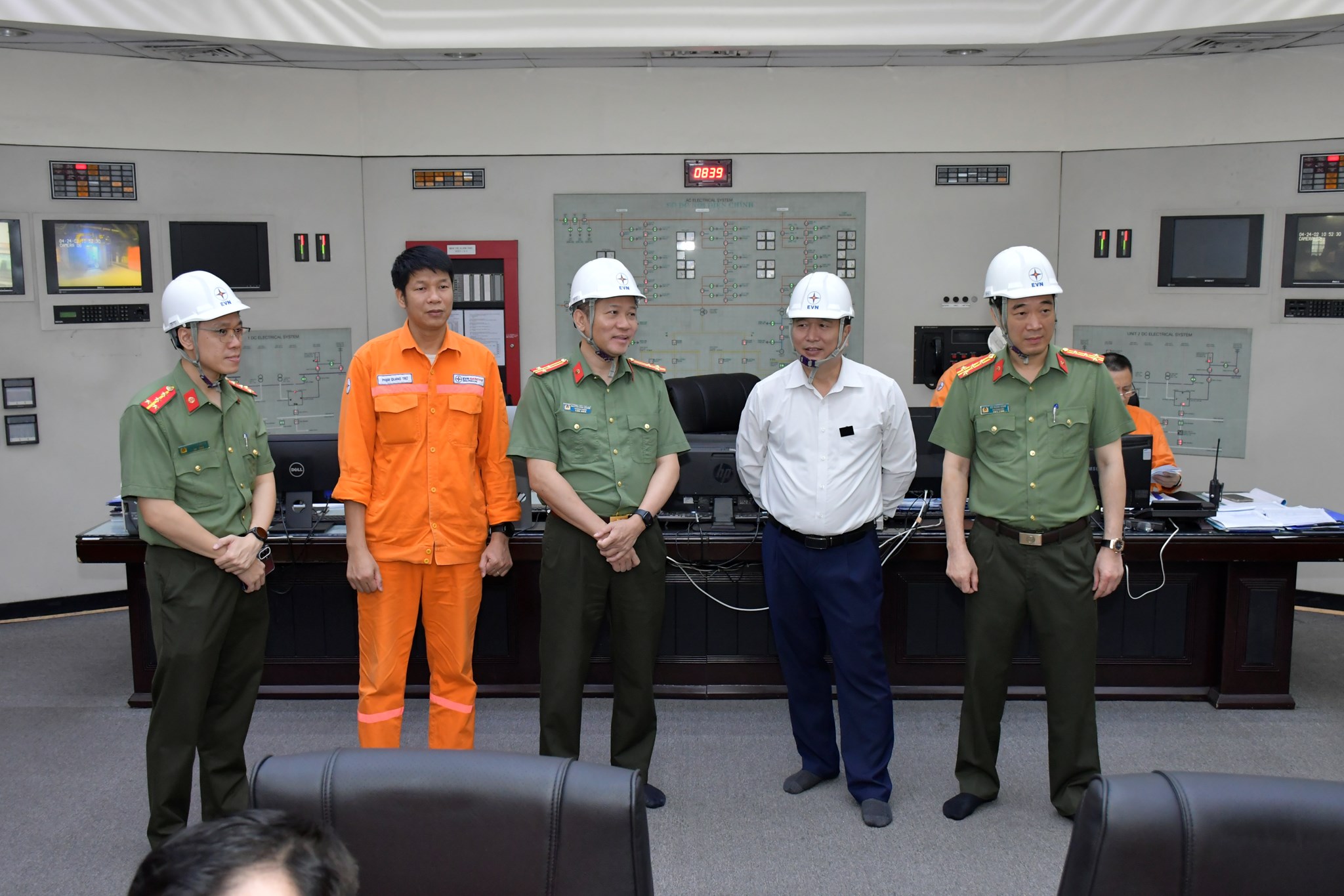 Đại tá Bùi Mạnh Hùng, Phó Giám đốc CATP cùng lãnh đạo phòng An ninh kinh tế tham quan dây chuyền sản xuất trong Công ty Cổ phần Nhiệt điện Phả Lại