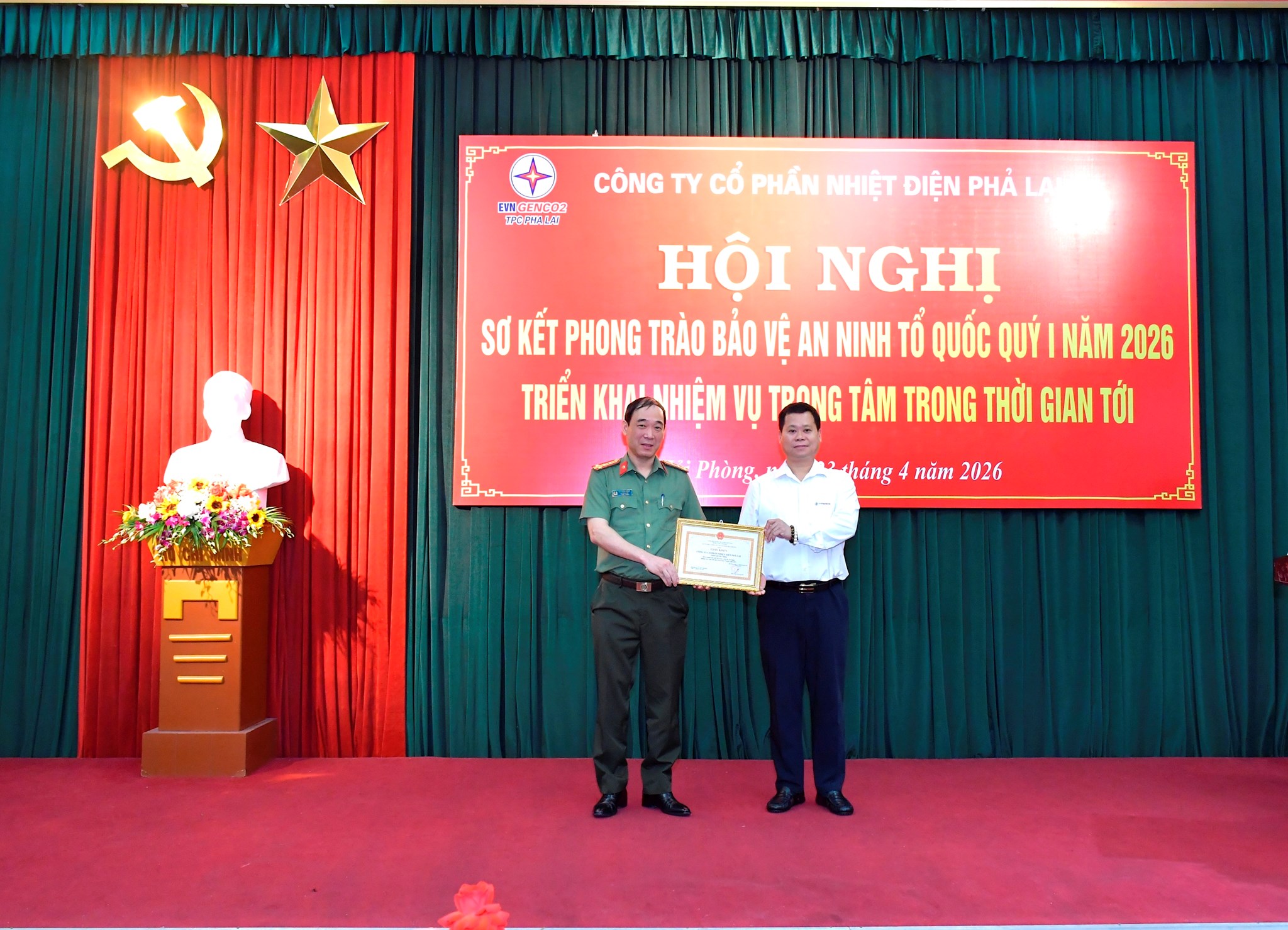 Đại tá Bùi Mạnh Hùng đã trao Giấy khen của Giám đốc CATP cho Công ty Cổ phần Nhiệt điện Phả Lại vì có thành tích xuất sắc trong phong trào toàn dân bảo vệ ANTQ năm 2025