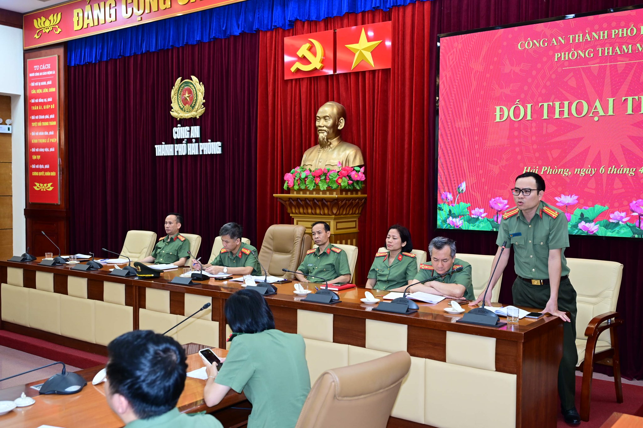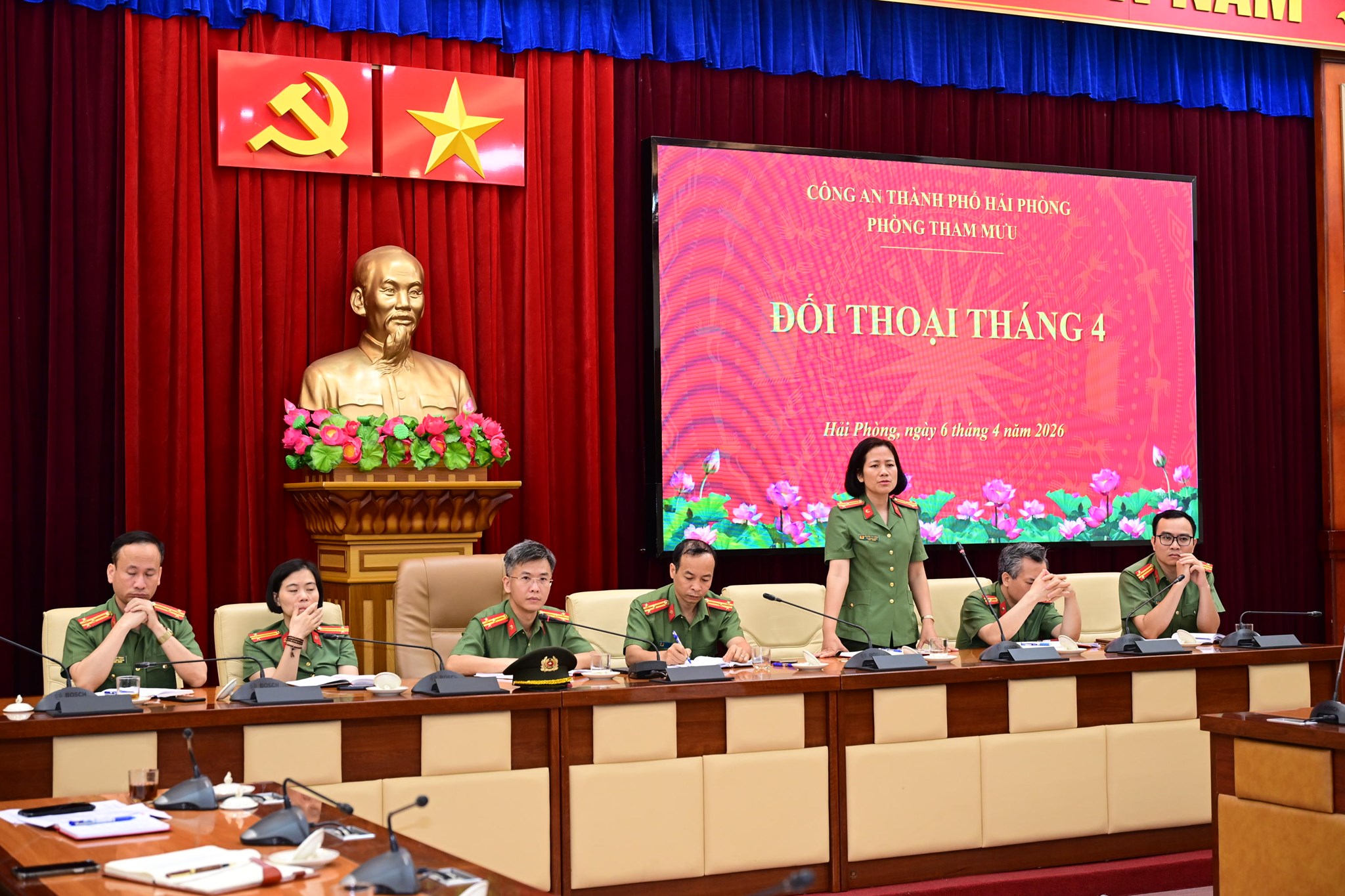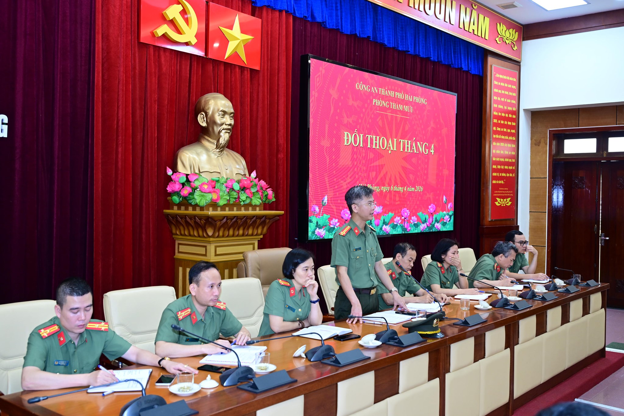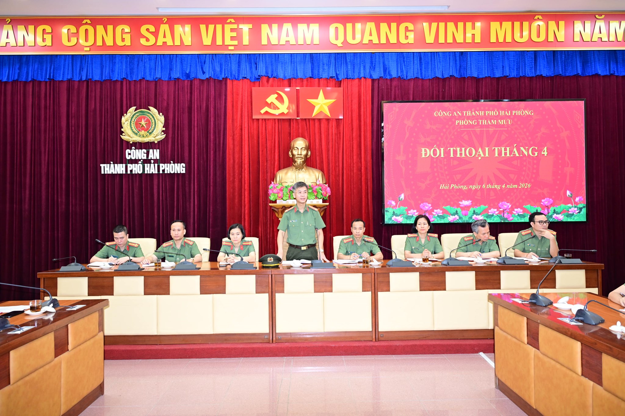 Nhân dịp này Phòng Tham mưu đã tổ chức cuộc đối thoại tháng 4 với nội dung thảo luận về: Nhiệm vụ tham mưu trong công tác Công an đặt ra trong “Kỷ nguyên vươn mình”, phục vụ cho mục tiêu thành phố tăng trưởng kinh tế năm 2026 là 13%; tháo gỡ những khó khăn, vướng mắc của từng đội, từng CBCS; trao đổi, kiến nghị công tác đổi mới, sáng tạo gắn với nhiệm vụ chuyên môn của đơn vị...